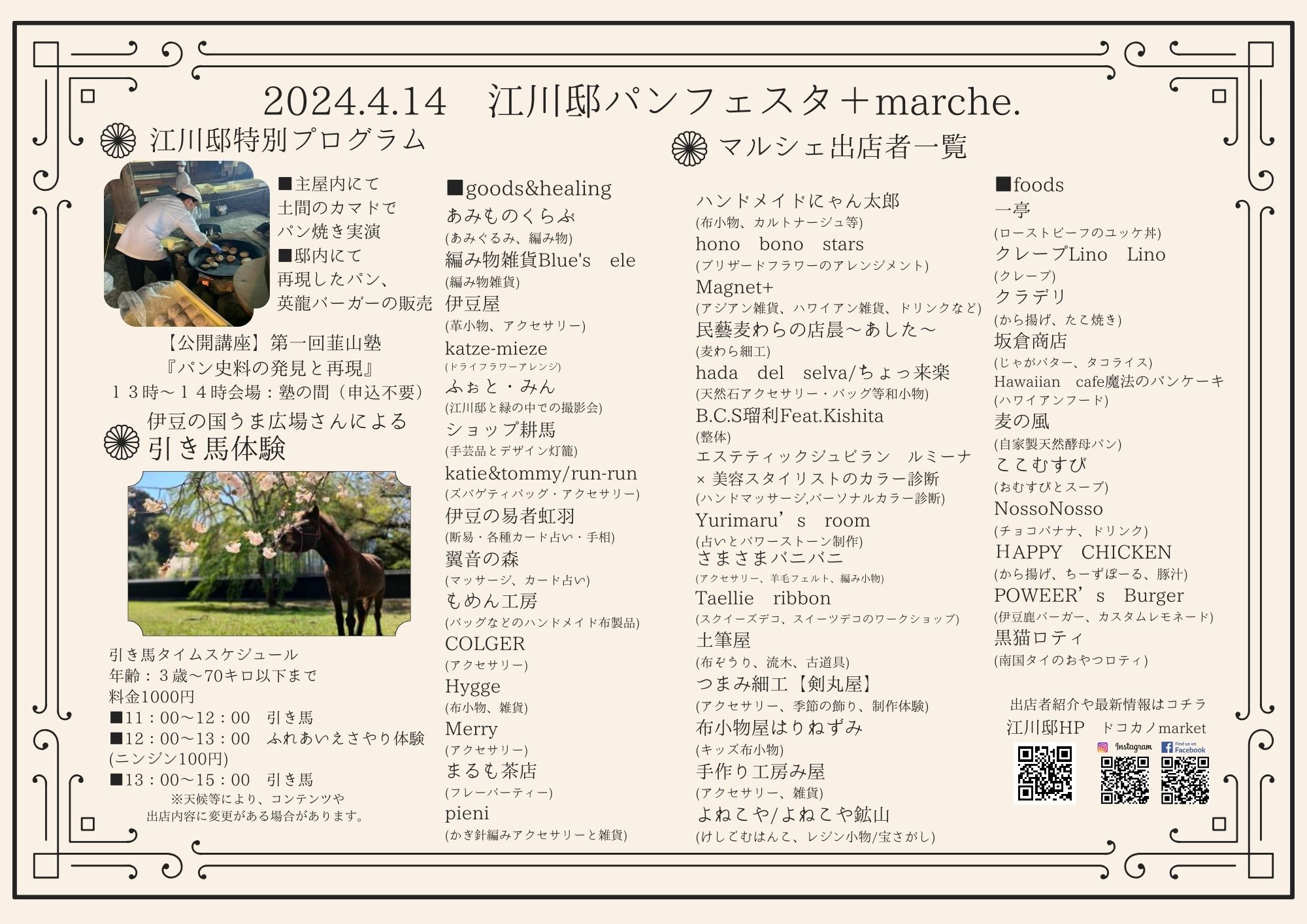 当日、邸内の主屋や書院の見学は有料にて解説付きでたっぷりご案内します。11時,12時,13時,14時の全4回。各回50分程度となります。書院や内庭などは通常非公開ですのでパンの日ならではの特別な邸内見学をお楽しみいただけます。